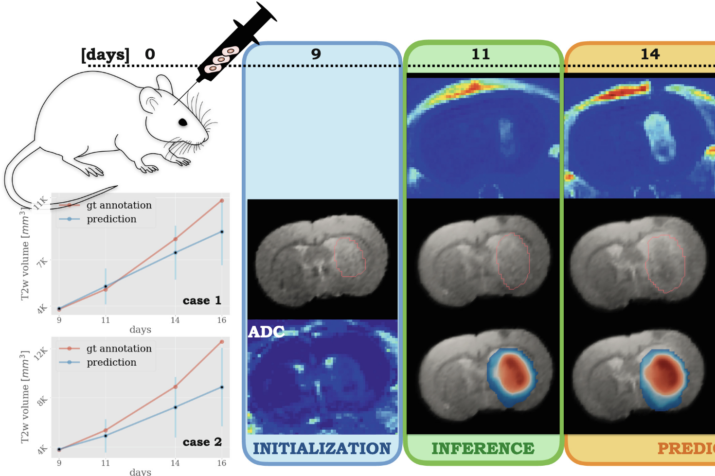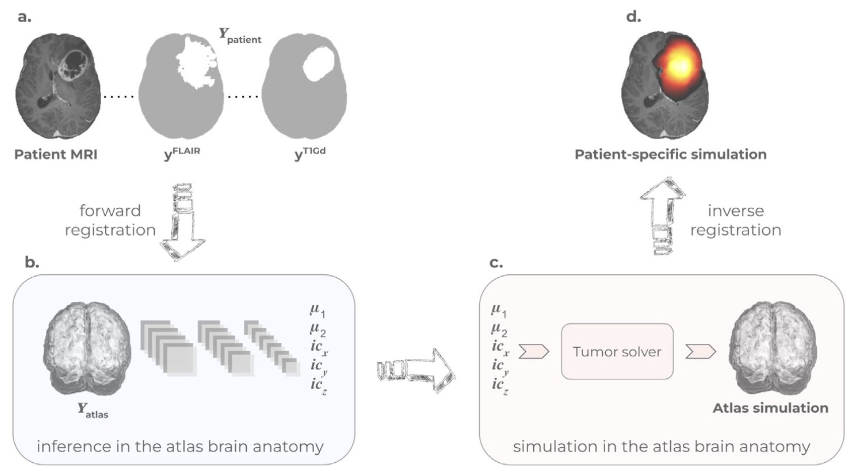 Learn-Morph-Infer: a new way of solving the inverse problem for brain tumor modelingIvan Ezhov, Kevin Scibilia, Katharina Franitza, Felix Steinbauer, Suprosanna Shit, Lucas Zimmer, Jana Lipkova, Florian Kofler, Johannes C Paetzold, Luca Canalini, and othersMedical Image Analysis[ bibtex | html | abstract ]@article{ezhov2023learn, title = {Learn-Morph-Infer: a new way of solving the inverse problem for brain tumor modeling}, author = {Ezhov, Ivan and Scibilia, Kevin and Franitza, Katharina and Steinbauer, Felix and Shit, Suprosanna and Zimmer, Lucas and Lipkova, Jana and Kofler, Florian and Paetzold, Johannes C and Canalini, Luca and others}, journal = {Medical Image Analysis}, volume = {83}, pages = {102672}, year = {2023}, publisher = {Elsevier}, html = {https://www.sciencedirect.com/science/article/pii/S1361841522003000}, abbr = {ezhov2023learn.png} }Current treatment planning of patients diagnosed with a brain tumor, such as glioma, could significantly benefit by accessing the spatial distribution of tumor cell concentration. Existing diagnostic modalities, e.g. magnetic resonance imaging (MRI), contrast sufficiently well areas of high cell density. In gliomas, however, they do not portray areas of low cell concentration, which can often serve as a source for the secondary appearance of the tumor after treatment. To estimate tumor cell densities beyond the visible boundaries of the lesion,numerical simulations of tumor growth could complement imaging information by providing estimates of full spatial distributions of tumor cells. Over recent years a corpus of literature on medical image-based tumor modeling was published. It includes different mathematical formalisms describing the forward tumor growth model. Alongside, various parametric inference schemes were developed to perform an efficient tumor model personalization, i.e. solving the inverse problem. However, the unifying drawback of all existing approaches is the time complexity of the model personalization which prohibits a potential integration of the modeling into clinical settings. In this work, we introduce a deep learning based methodology for inferring the patient-specific spatial distribution of brain tumors from T1Gd and FLAIR MRI medical scans. Coined as Learn-Morph-Infer, the method achieves real-time performance in the order of minutes on widely available hardware and the compute time is stable across tumor models of different complexity, such as reaction–diffusion and reaction– advection–diffusion models. We believe the proposed inverse solution approach not only bridges the way for clinical translation of brain tumor personalization but can also be adopted to other scientific and engineering domains.