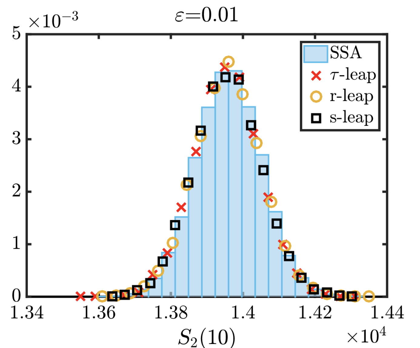 S-Leaping: An Adaptive, Accelerated Stochastic Simulation Algorithm, Bridging \backslashtau-Leaping and R-LeapingJana Lipkova, Georgios Arampatzis, Philippe Chatelain, Bjoern Menze, and Petros KoumoutsakosBulletin of Mathematical Biology[ bibtex | software | html | arXiv | abstract ]@article{lipkova2018s, title = {S-Leaping: An Adaptive, Accelerated Stochastic Simulation Algorithm, Bridging $\backslash$tau-Leaping and R-Leaping}, author = {Lipkova, Jana and Arampatzis, Georgios and Chatelain, Philippe and Menze, Bjoern and Koumoutsakos, Petros}, journal = {Bulletin of Mathematical Biology}, volume = {80}, number = {459}, year = {2018}, publisher = {Springer Nature}, html = {https://link.springer.com/article/10.1007/s11538-018-0464-9}, software = {https://github.com/JanaLipkova/SSM}, abbr = {lipkova2018s.png}, arxiv = {https://arxiv.org/pdf/1802.00296.pdf} }We propose the S-leaping algorithm for the acceleration of Gillespie’s stochastic sim- ulation algorithm that combines the advantages of the two main accelerated methods; the τ -leaping and R-leaping algorithms. These algorithms are known to be efficient under different conditions; the τ -leaping is efficient for non-stiff systems or systems with partial equilibrium, while the R-leaping performs better in stiff system thanks to an efficient sampling procedure. However, even a small change in a system’s set up can critically affect the nature of the simulated system and thus reduce the efficiency of an accelerated algorithm. The proposed algorithm combines the efficient time step selection from the τ -leaping with the effective sampling procedure from the R-leaping algorithm. The S-leaping is shown to maintain its efficiency under different conditions and in the case of large and stiff systems or systems with fast dynamics, the S-leaping outperforms both methods. We demonstrate the performance and the accuracy of the S-leaping in comparison with the τ -leaping and R-leaping on a number of benchmark systems involving biological reaction networks.