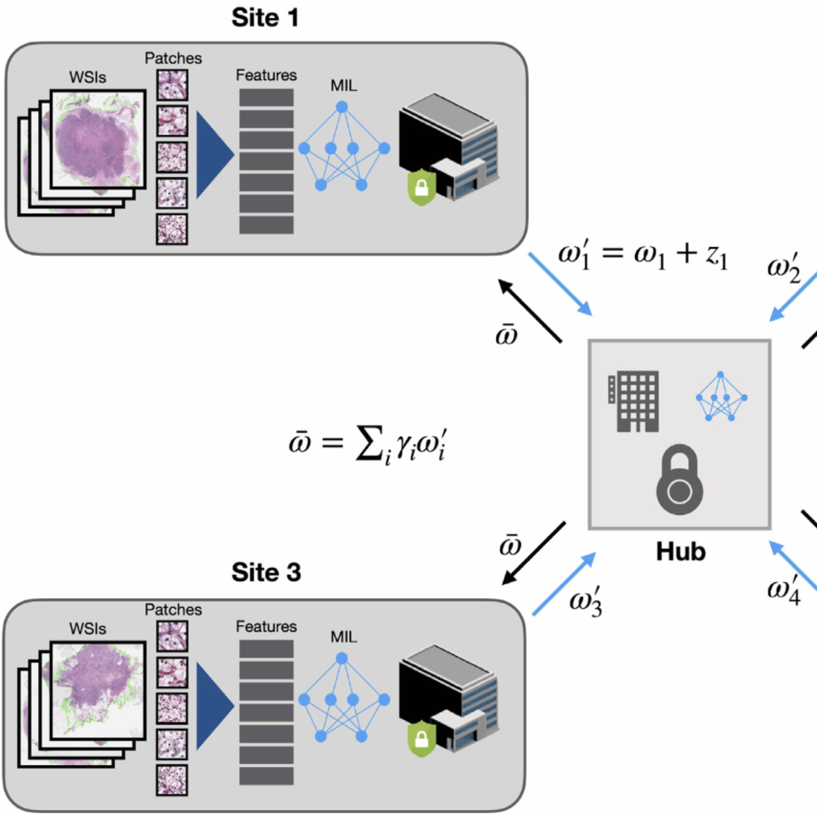 Federated learning for computational pathology on gigapixel whole slide imagesMing Y Lu, Richard J Chen, Dehan Kong, Jana Lipkova, Rajendra Singh, Drew FK Williamson, Tiffany Y Chen, and Faisal MahmoodMedical image analysis[ bibtex | software | html | arXiv | abstract ]@article{lu2022federated, title = {Federated learning for computational pathology on gigapixel whole slide images}, author = {Lu, Ming Y and Chen, Richard J and Kong, Dehan and Lipkova, Jana and Singh, Rajendra and Williamson, Drew FK and Chen, Tiffany Y and Mahmood, Faisal}, journal = {Medical image analysis}, volume = {76}, pages = {102298}, year = {2022}, publisher = {Elsevier}, html = {https://www.sciencedirect.com/science/article/pii/S1361841521003431}, software = {https://github.com/mahmoodlab/HistoFL}, arxiv = {https://arxiv.org/abs/2009.10190}, abbr = {lu2022federated.png} }Deep Learning-based computational pathology algorithms have demonstrated profound ability to excel in a wide array of tasks that range from characterization of well known morphological phenotypes to predicting non-human-identifiable features from histology such as molecular alterations. However, the development of robust, adaptable, and accurate deep learning-based models often rely on the collection and time-costly curation large high-quality annotated training data that should ideally come from diverse sources and patient populations to cater for the heterogeneity that exists in such datasets. Multi-centric and collaborative integration of medical data across multiple institutions can naturally help overcome this challenge and boost the model performance but is limited by privacy concerns amongst other difficulties that may arise in the complex data sharing process as models scale towards using hundreds of thousands of gigapixel whole slide images. In this paper, we introduce privacy-preserving federated learning for gigapixel whole slide images in computational pathology using weakly-supervised attention multiple instance learning and differential privacy. We evaluated our approach on two different diagnostic problems using thousands of histology whole slide images with only slide-level labels. Additionally, we present a weakly-supervised learning framework for survival prediction and patient stratification from whole slide images and demonstrate its effectiveness in a federated setting. Our results show that using federated learning, we can effectively develop accurate weakly supervised deep learning models from distributed data silos without direct data sharing and its associated complexities, while also preserving differential privacy using randomized noise generation.