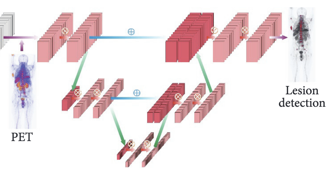 Automated whole-body bone lesion detection for multiple myeloma on 68Ga-pentixafor PET/CT imaging using deep learning methodsLina Xu, Giles Tetteh, Jana Lipkova, Yu Zhao, Hongwei Li, Patrick Christ, Marie Piraud, Andreas Buck, Kuangyu Shi, and Bjoern H MenzeContrast media & molecular imaging[ bibtex | html | abstract ]@article{xu2018automated, title = {Automated whole-body bone lesion detection for multiple myeloma on 68Ga-pentixafor PET/CT imaging using deep learning methods}, author = {Xu, Lina and Tetteh, Giles and Lipkova, Jana and Zhao, Yu and Li, Hongwei and Christ, Patrick and Piraud, Marie and Buck, Andreas and Shi, Kuangyu and Menze, Bjoern H}, journal = {Contrast media \& molecular imaging}, volume = {2018}, year = {2018}, publisher = {Hindawi}, abbr = {xu2018automated.png}, html = {https://www.hindawi.com/journals/cmmi/2018/2391925/} }The identification of bone lesions is crucial in the diagnostic assessment of multiple myeloma (MM). 68Ga-Pentixafor PET/CT can capture the abnormal molecular expression of CXCR-4 in addition to anatomical changes. However, whole-body detection of dozens of lesions on hybrid imaging is tedious and error prone. It is even more difficult to identify lesions with a large heterogeneity. This study employed deep learning methods to automatically combine characteristics of PET and CT for whole-body MM bone lesion detection in a 3D manner. Two convolutional neural networks (CNNs), V-Net and W-Net, were adopted to segment and detect the lesions. The feasibility of deep learning for lesion detection on 68Ga-Pentixafor PET/CT was first verified on digital phantoms generated using realistic PET simulation methods. Then the proposed methods were evaluated on real 68Ga-Pentixafor PET/CT scans of MM patients. The preliminary results showed that deep learning method can leverage multimodal information for spatial feature representation, and W-Net obtained the best result for segmentation and lesion detection. It also outperformed traditional machine learning methods such as random forest classifier (RF), 𝑘-Nearest Neighbors (k-NN), and support vector machine (SVM). The proof-of-concept study encourages further development of deep learning approach for MM lesion detection in population study.