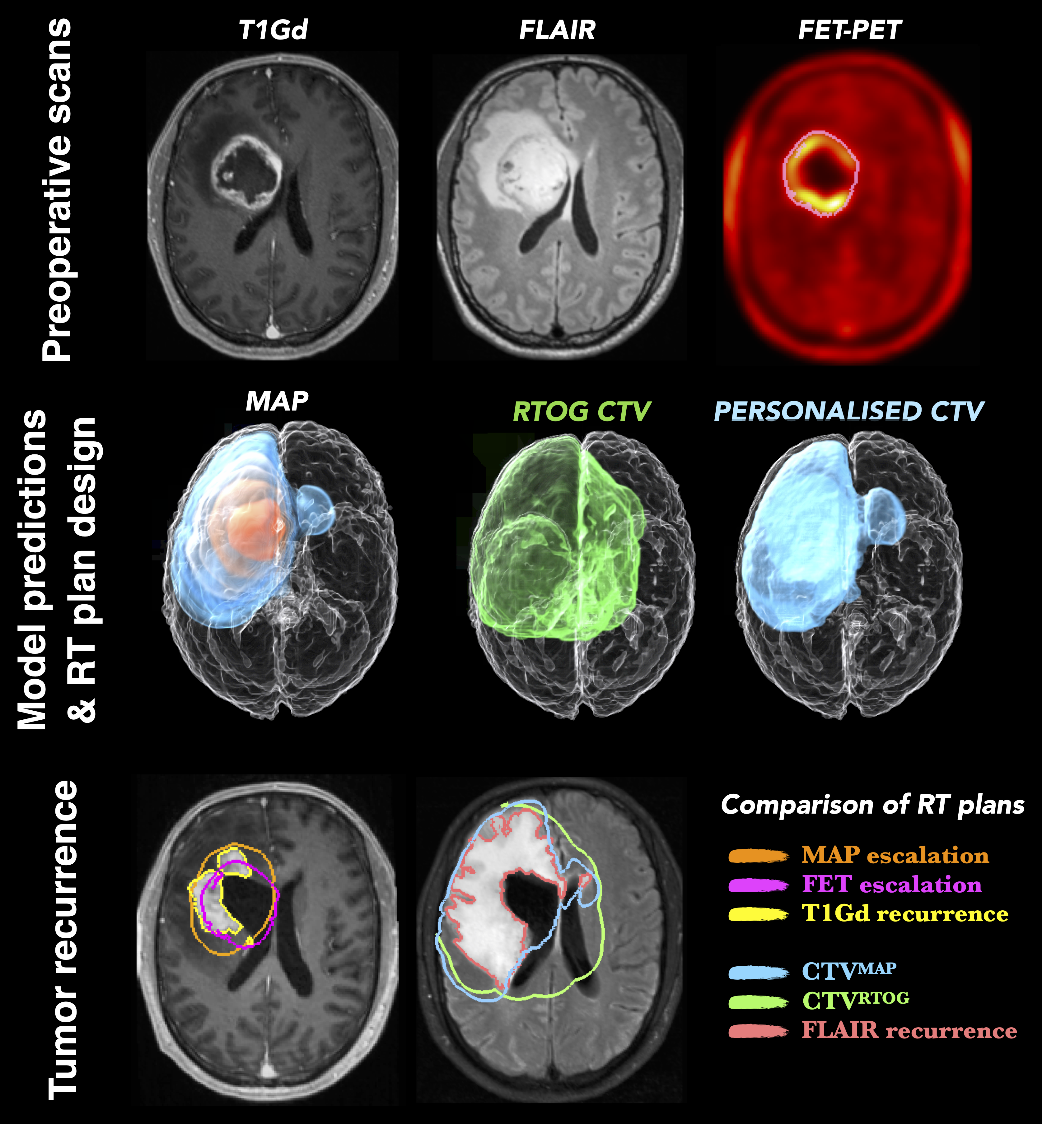 - An initial clinical population study shows that the radiotherapy plans generated from the inferred tumor cell infiltration maps spare more healthy tissue thereby reducing radiation toxicity while yielding comparable accuracy with standard radiotherapy protocols