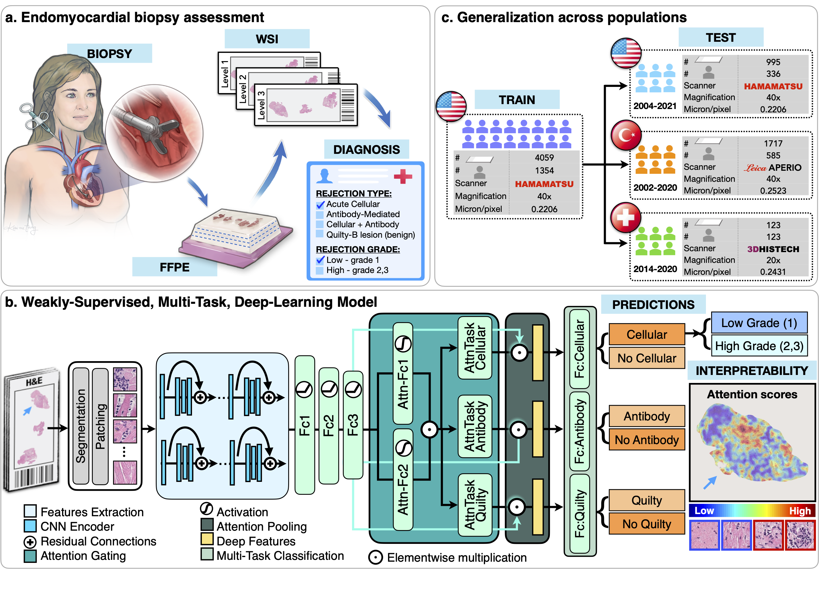 - Interpretable AI-model for simultaneous identification of heart rejection type (cellular and/or antibody-mediated), grade & benign rejection mimickers, such as Quilty-B lesions, from H&E stained whole-slide EMB images